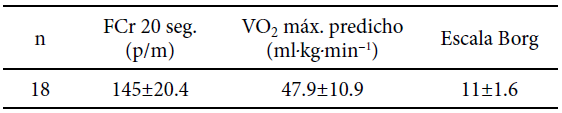La Tabla 2 muestra los resultados del test en escalón como la FCr registrada a los 20 segundos después de terminada la prueba. De acuerdo a esto se estimó el VO2 máx. con la ecuación de McArdle (Nieman, 2011). Con respecto a la percepción del esfuerzo en promedio los sujetos describieron el test como leve.