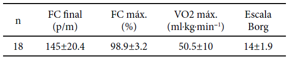 La Tabla 3 muestra los resultados obtenidos del test de Bruce como es la FC final registrada una vez terminado el test. Además se advierte que todos los participantes superaron el 90 % de su FC máx., lo cual se estableció como un criterio para claudicar la prueba y determinar el VO. máx.