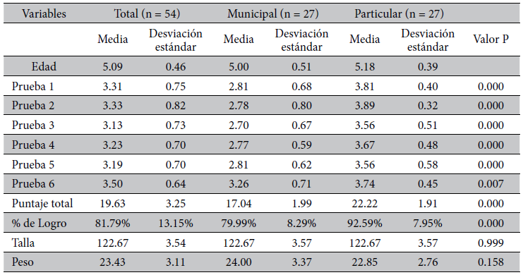 En la comparación de las variables, según tipo de establecimiento, los estudiantes del colegio particular, presentan diferencias significativas en todas las pruebas del test, frente a los resultados de la escuela municipal. Los estudiantes del colegio particular, presentan mayor desarrollo psicomotor obteniendo diferencias significativas en el total del test (p < 0.05). El peso y la talla no presentaron diferencias significativas (p > 0.05) (Tabla 1).