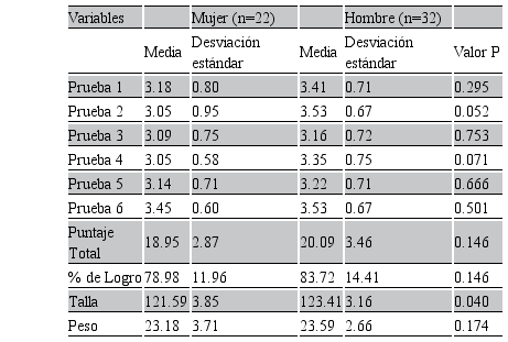 Al comparar las variables según su género, se aprecia que no existieron diferencias significativas en el rendimiento motor, solo la talla presentó diferencias, con un valor superior en los hombres. Esto concuerda con lo obtenido en la revisión bibliográfica, al investigar las diferencias de rendimiento físico entre niños y niñas, se indica que las diferencias biológicas son demasiado pequeñas y no pueden determinar tantas ventajas en los varones sobre las mujeres. En la niñez las aptitudes físicas son prácticamente iguales en ambos sexos (Losada, 2008).