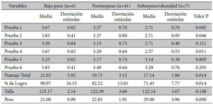 Al comparar las variables con el estado nutricional de los menores (Tabla 3), los sujetos con sobrepeso u obesidad, categorizados en malnutrición por exceso presentaron un rendimiento motor inferior en comparación con los normopeso y el grupo bajo peso; en las pruebas 1, 2, 4 y 6 el puntaje total y el porcentaje de logro, presentaron diferencias significativas (p < 0.05). Las pruebas 3, 5 y 6 no alcanzaron significancia (p > 0.05) (Tabla 3).