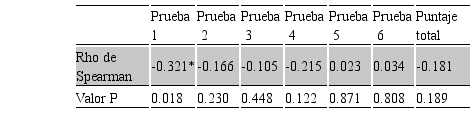 Al aplicar la asociación de variables; peso y test. En la Prueba 1 presentó asociación negativa con el peso y de forma significativa (p=0.018), a mayor peso es menor el resultado en este Test. Las demás pruebas no presentaron asociación significativa (p>0.05) (Tabla 4).