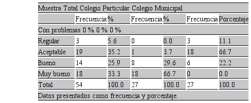 Al evaluar las frecuencias según los baremos de clasificación del test, los menores de la escuela municipal concentraron sus resultados en el nivel aceptable. Y los estudiantes del colegio particular concentraron el porcentaje más alto de frecuencia en el nivel muy bueno.