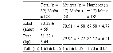 De los 74 participantes que iniciaron la intervención, 4 abandonaron y 11 no cumplieron con la asistencia mínima a las sesiones (>70%). Por lo tanto, 59 adultos mayores (47 mujeres y 12 hombres) completaron el programa de estimulación físico-cognitiva. Las características basales de esta muestra son descritas en la Tabla 1.