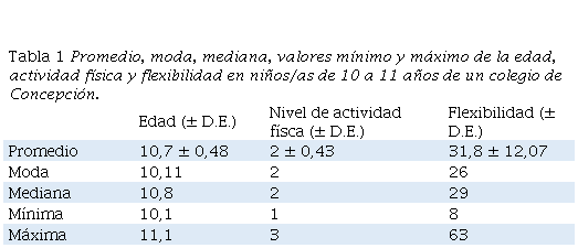 Se aprecia en la Tabla 1 que el promedio de edad de los escolares fue de 10,7 ± 0,48 años, el máximo de edad fue de 11,1 años, en cuanto al nivel de actividad física el promedio que se obtuvo en la clasificación fue de 2 ± 0,43 lo que se categoriza como regular, en cambio en la flexibilidad el valor promedio fue de 31,8 ± 12,07 cm, el mínimo 8 cm y el máximo obtenido fue de 63 cm, Se observa en este caso una alta dispersión.