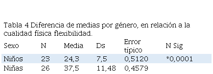 En la Tabla 4, se evidencia la diferencia estadísticamente significativa entre el género y el nivel de flexibilidad de los estudiantes; las niñas obtienen valores significativamente mayores que los niños (. < .001).