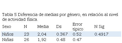 En la Tabla 5, se aprecia que no existe diferencia estadísticamente significativa entre niños y niñas respecto del nivel de actividad física.