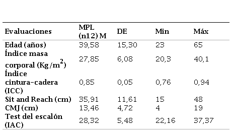 Se evaluaron 12 mujeres privadas de libertad del Centro Penitenciario de Concepción de la región del Biobío. Se realizaron mediciones antropométricas, pruebas de condición física y aplicación de un cuestionario de calidad de vida. La edad promedio presentada por las MPL fue de 39,58 ± 15,30 años. La Tabla 1 muestra los resultados antropométricos y de condición física obtenida de la muestra total.
