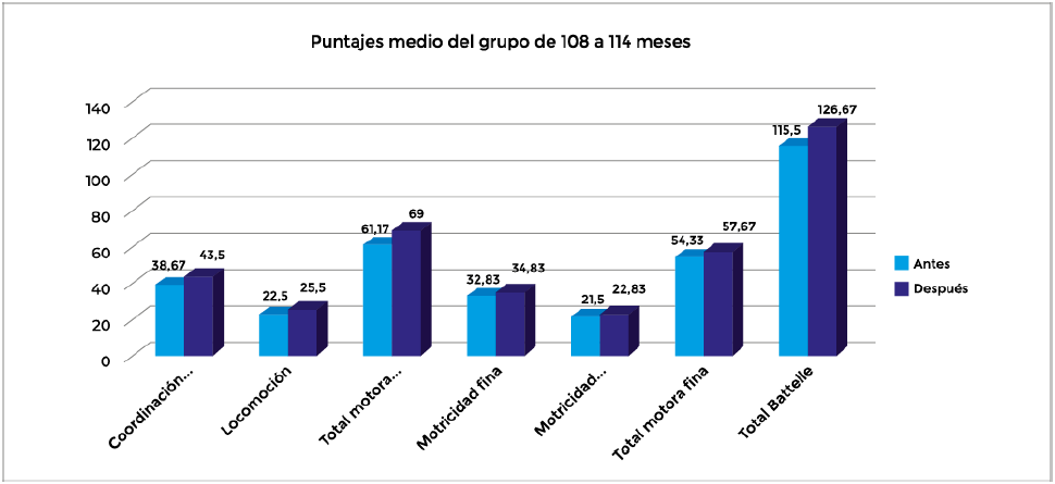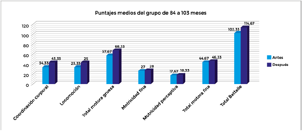 En la Figura 1, se observan los puntajes medios del desarrollo motor antes y después del programa para los niños de 84 a 103 meses (N = 3). En todas las áreas se observa un aumento en el puntaje de Battelle; este aumento se ve más marcado en lo que se refiere la coordinación corporal (9 puntos). Este grupo lo conforman un niño y dos niñas, en que el avance fue más notorio entre las niñas. En locomoción se presentó un aumento de casi dos puntos. De igual forma, las niñas tuvieron un mejor desarrollo en esta área. En lo que respecta a las habilidades relacionadas con motricidad fina, se presentó un retraso significativo en el niño y en una de las niñas de este grupo, por lo que el aumento grupal fue solo de un punto y esto se debió al avance de la otra niña, quien tuvo un cambio significativo en esta área de 11 puntos. En motricidad perceptiva, las niñas tuvieron un aumento satisfactorio de tres puntos, sin embargo, el niño presentó un retraso de cuatro puntos.