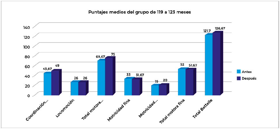 Descripción del desarrollo motor para el grupo de edad de 119 a 123 meses antes y después del programa