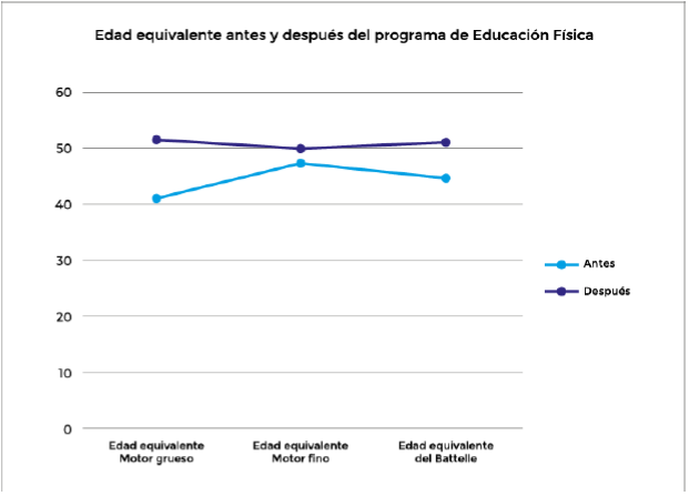 En lo que respecta a la edad equivalente, antes del programa, los niños desarrollaban actividades correspondientes a 41 semanas. El programa contribuyó particularmente al desarrollo las habilidades que vinculadas con el motor grueso, dado que ellos lograron desarrollar estas habilidades conforme a niños de 52 semanas. En las habilidades motoras finas no se logran grandes avances, pero tampoco hay un retroceso. Las actividades que desarrollaron después del programa fueron equivalentes a niños de 50 semanas, logrando lanzar pelotas, correr más de un metro sin caerse, pero no lograban extraer, por ejemplo, un objeto de una botella.