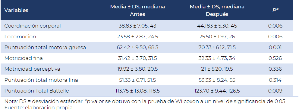 Al inicio del programa, en la subárea de coordinación corporal, los niños obtuvieron una media de 38.33 (DS = 7.05) de puntuación directa. Después del programa, hubo un aumento significativo (p = 0.006) de 5.35 puntos en su control corporal. En lo que se refiere a locomoción, también se observaron cambios significativos. Antes del programa de educación física, los niños obtuvieron un puntaje medio de 23.58 (DS = 2.87) al finalizar, el puntaje subió a 25.50 (DS = 1.97). Con respecto al desarrollo motor fino, aunque se observan puntajes más altos después del programa, éstos no fueron significativos. En general, el programa si logra cambios significativos (p = 0.009) en el puntaje total del Inventario de Desarrollo Battelle, siendo más manifiestos estos cambios en motricidad gruesa.