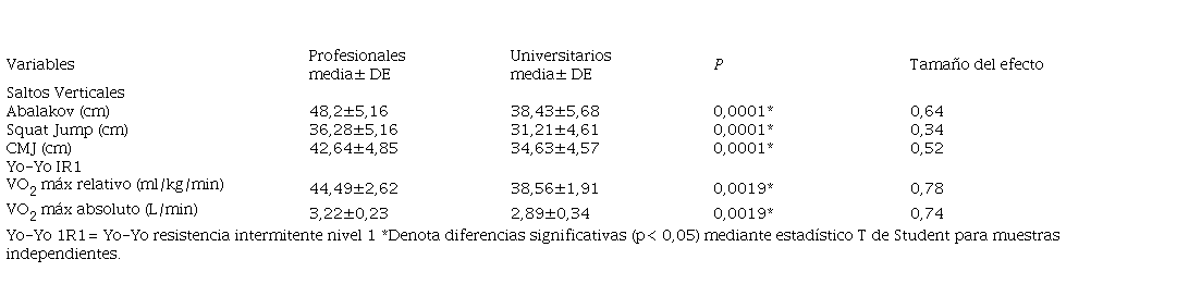 En la Tabla 3, se encuentran los resultados obtenidos en las pruebas físicas. Los futbolistas profesionales poseen mayor capacidad de salto en los tres saltos evaluados: SJ, Abalakov y CMJ (p<0,05) y mayor capacidad fisiológica (consumo máximo de oxígeno), tanto en el VO2 máx relativo como absoluto (p= 0,0019), donde se evidenció una diferencia significativa. Sin embargo, el tamaño del efecto en la capacidad de salto fue de pequeño a moderado, a diferencia del VO2 máx que fue un efecto moderado.
