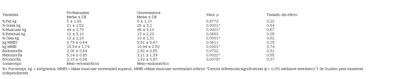 En la Tabla 2, se describe la composición corporal, donde se encontraron diferencias significativas entre profesionales y universitarios en el porcentaje de masa grasa, muscular y ósea (.< 0,05). Los futbolistas profesionales presentan un menor porcentaje de masa grasa y un mayor porcentaje de masa muscular y óseo con respecto a los universitarios (. = 0,0001). En cuanto a la masa muscular por segmento solo se encontraron diferencias significativas en la masa muscular del miembro inferior (MMEI) (.= 0,0001). Finalmente, en cuanto al somatotipo se encontraron diferencias en mesomorfía y ectormofía. En todas estas variables se encontró un tamaño del efecto moderado a excepción de la ectomorfia, donde el tamaño del efecto es pequeño.