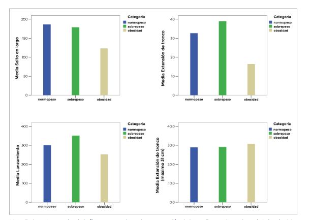 Nota: En la parte superior de la figura, se puede ver la comparación de la media en salto en largo (a la izquierda) y flexión de tronco (a la derecha) en los 3 grupos. En la parte inferior se comparan los resultados de la media de lanzamientos (a la izquierda) y la extensión de tronco (a la derecha).
