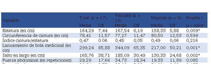Se resumen las características de la muestra en la Tabla 1 y se indican, los valores promedio ±DS para las variables antropométricas y aptitud muscular. La prueba T de comparación de medias, mostró diferencias significativas en los valores de estatura (p = 0,009), SL (p = 0,002), LBM (p = 0,001) y el IAM (p = 0,029) a favor de los varones.