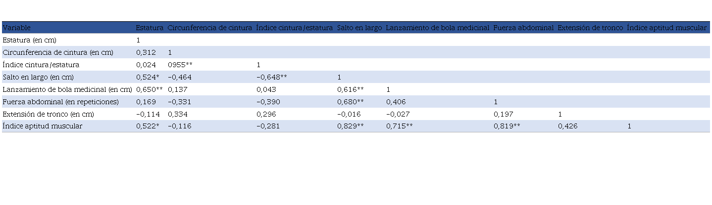 En la Tabla 2, se exponen las correlaciones entre las variables antropométricas y las de aptitud muscular.