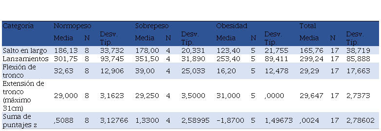 La siguiente Tabla 3, nos muestra la comparación entre las categorías normopeso, sobrepeso y obesidad en las variables de aptitud muscular. Los alumnos en categoría obesidad obtuvieron, en general, valores de medias menores en SL, LBM y FT.