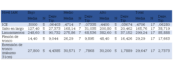 La Tabla 4, nos muestra la comparación entre los casos que pertenecen a un IAM bajo, medio o alto en cada variable de Aptitud muscular y el ICE. Coinciden los alumnos con IAM alto con una media ICE más baja que en las categorías baja o media.