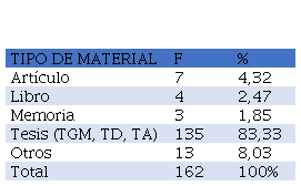 · 49 trabajos (30,25%) son trabajos de grado de universidades; tres (1,85%) son ponencias presentadas en congresos internacionales y nacionales, uno (0,61) es un artículo presentado en una revista digital, y uno (0,61%) es un simposio presentado en una universidad nacional.