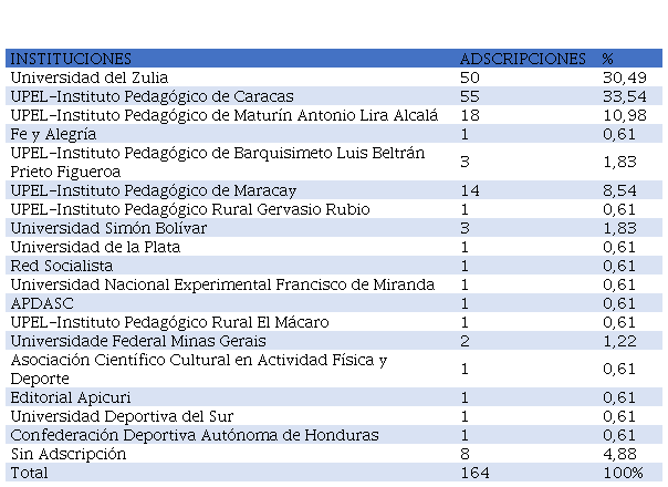 Las instituciones que cuentan con mayor producción en este contexto son: la UPEL-IPC, LUZ, y cierra el Instituto Pedagógico de Maturín Antonio Lira Alcalá (UPEL-IPMALA). Vale destacar que hay un trabajo que tiene tres autores (por lo que se duplica un par de filiaciones).