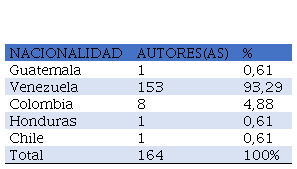· 65 autores(as) son venezolanos(as), y 12 son extranjeros(as), de los cuales: nueve son de nacionalidad colombiana, uno es guatemalteco, hay un hondureño y un chileno. De los extranjeros, dos residían y ejercían como profesores en Venezuela desde antes de cursar la Maestría en Recreación en LUZ y continuaron residiendo y ejerciendo la docencia universitaria después de egresar.