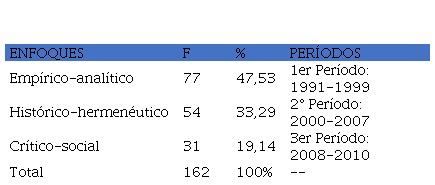 En cuanto a los enfoques de investigación, tenemos que el empírico-analítico ha sido el enfoque de mayor presencia, seguido por el histórico-hermenéutico y cerrando con el enfoque crítico-social, lo que ha permitido periodizar el reflejo en la predominancia. Además de las tablas presentadas anteriormente, hay otros resultados que comentar tras un análisis mucho más detallado. En cuanto a los períodos, tendríamos que mencionar que el primer período en estudio (1991-1999) destaca como el más productivo, con un 47,53%. Pero, bien vale destacar que el rango de tiempo en cada uno de los períodos es diferente, y esto se explica habida cuenta la caracterización en los enfoques de investigación que ha permitido aglutinar los trabajos en dichos períodos.