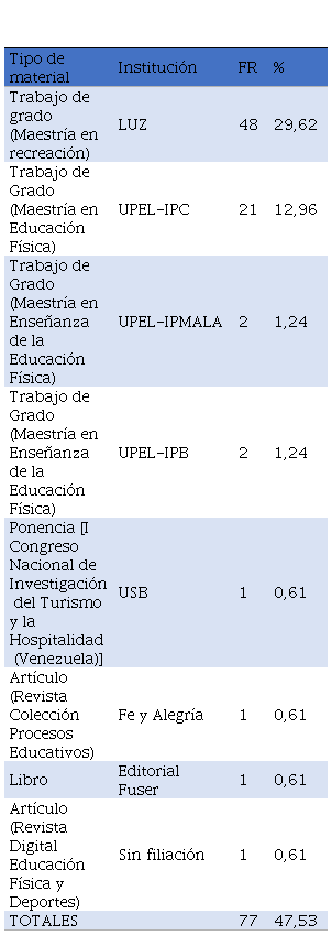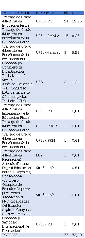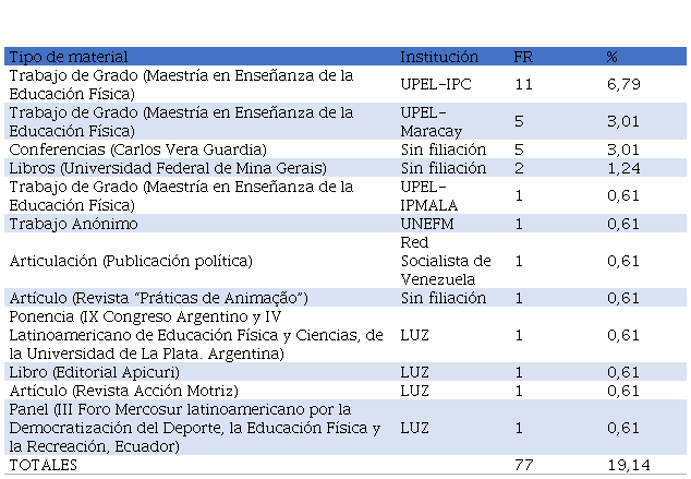 a) 16 trabajos (9,87%) son tesis de grado de universidades venezolanas, de los cuales 15 (9,25%) son de la misma universidad –UPEL–, específicamente de las sedes de la UPEL-Maracay, la UPEL-IPMALA y principalmente del núcleo UPEL-IPC, que aporta 11 (6,79%); b) dos (1,24%) son publicaciones de una revista electrónica de un centro de investigación de la UPEL-Maracay; c) uno (0,61%) es un artículo de una publicación política nacional; d) cuatro (2,50%) son publicaciones internacionales, de las cuales dos (1,31%) son auspiciadas por una universidad y dos (1,31%) por una organización científico-académica independiente. Fueron elaboradas por una profesora de UPEL-Maracay y por un profesor de LUZ; e) uno (0,61%) es un libro publicado por la Editorial Apicuri. Rio de Janeiro-Brasil: Consejo Nacional de Pesquisa de Brasil (CNPQ) elaborado por un profesor de la Universidad del Zulia; f) uno (0,61%) es una ponencia en el IX Congreso Argentino y IV Latinoamericano de Educación Física y Ciencias, de la Facultad de Humanidades y Ciencias de la Educación de la Universidad de La Plata (Argentina), por un profesor de la Universidad del Zulia; g) cinco (3,01%) son ponencias en conferencias, de las cuales dos son nacionales y tres son internacionales, dictadas por el profesor Carlos Veraguardia.