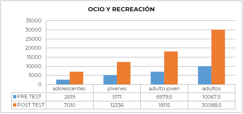 En el Dominio Ocio y recreación, todas las categorías aumentan después de participar en el programa (Figura 4), en más de un 50%.