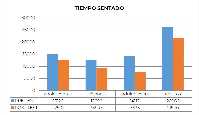 Conforme a lo expuesto en la Figura 5, se evidencia una disminución significativa del “tiempo sentado”, luego de participar en el programa. En todas las categorías, se presenta una disminución sobre un 15% en el tiempo sentado.