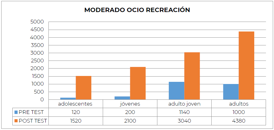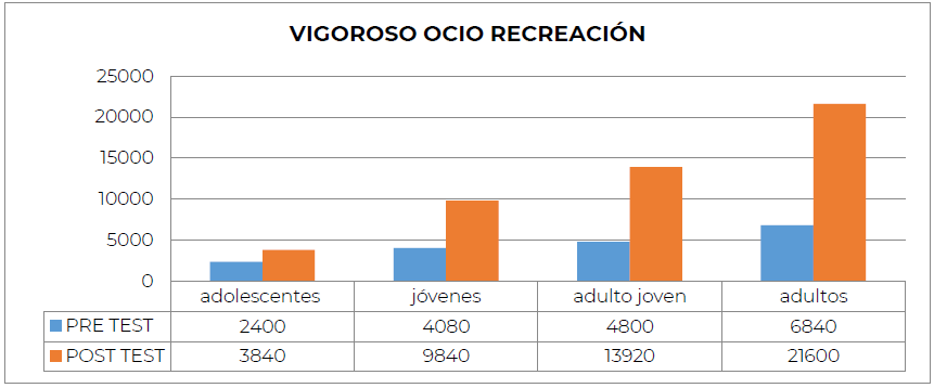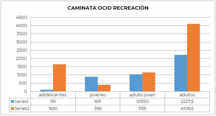 Casi todas las categorías aumentaron en el dominio Caminata Ocio Recreación, principalmente adolescentes y adultos. No obstante, la categoría de jóvenes, evidencia una disminución en más de la mitad entre el pre y pos test en dicho dominio. Si bien casi todas las categorías aumentan considerablemente, sólo la categoría “Jóvenes” presenta una disminución significativa comprándolo entre el pre y pos test en este Dominio (Figura 8).