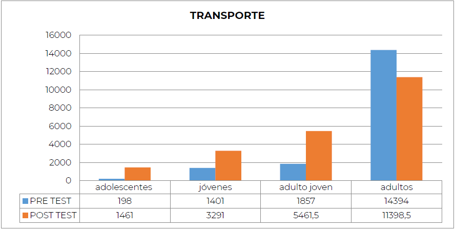 En el dominio de Transporte, todas las categorías aumentan luego de participar en el programa y lo arrojado en el post test, a excepción de la categoría adultos, en el que se evidencia una disminución en el post test para dicho dominio.