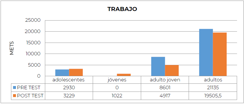 La Figura 3, evidencia que casi todas las categorías aumentan sus MET después de participar en el programa. Sólo en la categoría Adulto joven, se evidencia una disminución en dicho dominio. Todas las categorías aumentan sobre un 20%, a excepción de una (adulto-joven) que disminuyó sobre un 10% (Tabla 6).