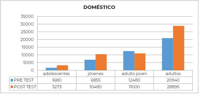 En cuanto al dominio de las Tareas del hogar, los investigadores antes mencionados (Serón et al., 2010), infieren que hay un bajo nivel de actividad, mientras que, en el presente estudio, los resultados se manifiestan a favor en los grupos adolescentes, jóvenes y adultos, en cambio, en el grupo adulto joven hay una leve disminución.