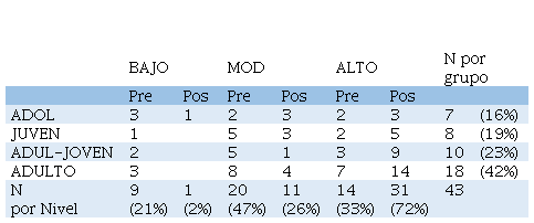De acuerdo al nivel de AF Total se presentan los resultados obtenidos en porcentaje por los diferentes grupos, en el pre y pos test. Se observa una alta concentración de participantes en la categoría “Bajo” durante el pre test, quienes luego del pos test, pasan a distribuirse en los otros dos niveles “Medio” y “Alto”. De los 43 sujetos, sólo uno quedó en nivel Bajo tras el post test. La concentración del nivel de AF en el pre test fue en las categorías baja y moderado, lo que se modifica en el post test hacia las categorías “moderadas” y “altas” (Tabla 2).