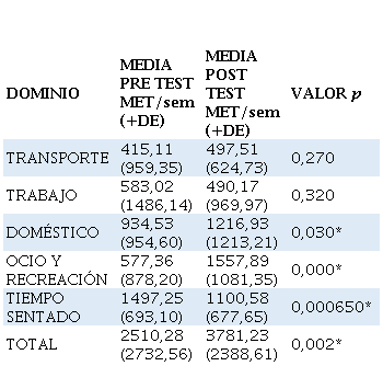 Se observó una mejora en los cuatros dominios analizados en las participantes del programa de intervención, con una mejora considerable, en todas las edades. El dominio Transporte se mejora en un 50% en relación a los datos del pre test. En el dominio Trabajo, la mejora es de un 10%. En el dominio Doméstico, la variabilidad fue un alza entre el 10 y 20%. Así como en el dominio Ocio y Recreación, el cambio fue positivo doblando el nivel de desempeño.