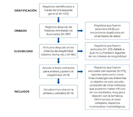 Se escogieron los estudios mediante la búsqueda sistemática de la literatura científica en las diferentes bases de datos previamente enunciadas, aplicando el cribado correspondiente con respecto a los criterios de elegibilidad para así determinar las investigaciones que se utilizaran en esta revisión; con respecto a la extracción de los estudios, se examinaron minuciosamente los títulos y resúmenes de cada artículo y, de esta manera, establecer si se relacionan con la temática de interés, y así eliminar los artículos claramente irrelevantes; para ello fue preciso considerar la utilidad y la relevancia del tema estudiado y la credibilidad o experiencia del autor en la temática.