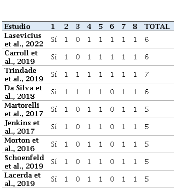 Dentro de la evaluación metodológica, se excluyeron los ítems del cegamiento, por lo tanto, la escala PEDro quedó modificada cambiando su puntuación (Schoenfeld et al., 2017, citados por Baz-Valle et al., 2018). Según esto, la Tabla 1, muestra la calidad de todos los artículos y su puntuación de 1 a 7 (validez interna). Todos los artículos cumplieron con el ítem de validez externa, y sólo un estudio de los evaluados obtuvo una calificación regular debido a que no se hizo explícito dentro de la metodología la aleatorización y asignación de los participantes después de una lectura exhaustiva del manuscrito.