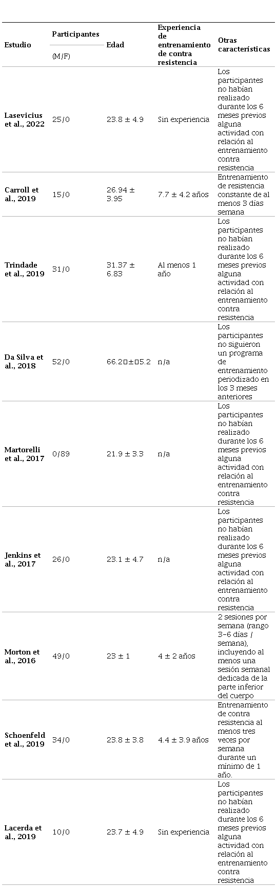 De los nueve estudios incluidos para análisis, seis de estos corresponden a la base de datos de Pubmed (Lasevicius et al., 2022; Carroll et al., 2019; Trindade et al., 2019; Schoenfeld et al., 2019; Lacerda et al., 2019; Martorelli et al., 2017), y los tres estudios restantes, corresponden a Google académico (Da Silva et al., 2018; Jenkins et al., 2017; Morton et al., 2016). Por otra parte, de las bases de datos como ScienceDirect, Sportdiscus y Scopus, no se obtuvieron recursos relevantes para la revisión.