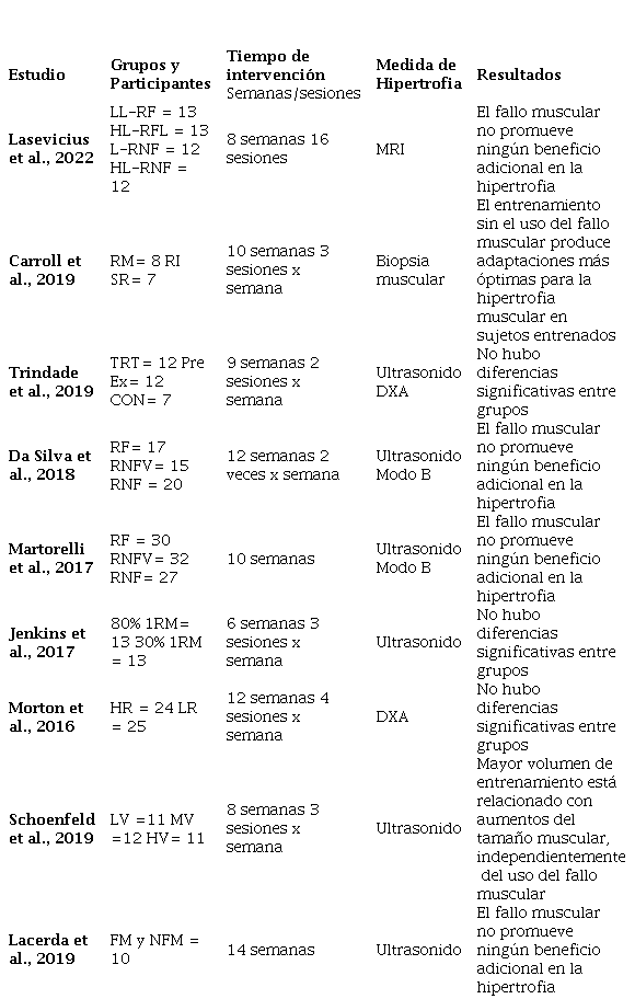 El análisis del fallo muscular en la hipertrofia comprendió nueve estudios, con un total de 331 participantes (249 hombres y 89 mujeres, sanos, sin ningún tipo de patología). En el rango de edad de casi todos los estudios, los participantes se encuentran en un rango de 21 a 31 años, y solamente un estudio evaluó adultos mayores. Debido a la diversidad metodológica, se sintetizó la información en la Tabla 2 y Tabla 3 con los resultados más descriptivos de las diversas intervenciones y medidas que se utilizaron para cada estudio.
