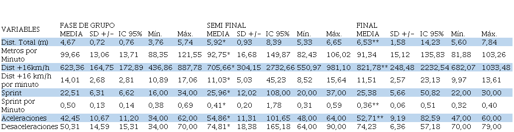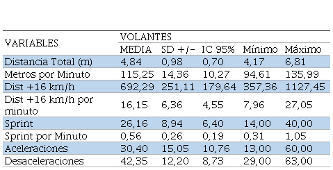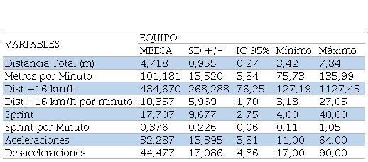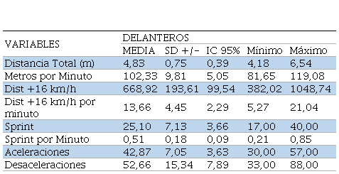 Las variables analizadas fueron divididas en dos, por un lado, las variables de volumen y, por otro, las de intensidad. Las primeras fueron: Distancia Total (m), Distancia en Sprint (entre 16 a 19 km/h) (m) 484,67 ± 268,28; Cantidad de Sprints (>19 km/h) (rep) 17,70 ± 9,67; Aceleraciones >2 m/s. (rep) 32,28 ± 13,39 y Desaceleraciones >-2 m/s. (rep) 44,47 ± 17,08. En cambio, las variables de intensidad fueron: metros por minuto (m) 101,18 ± 13,52; Distancia en Sprint por Minuto (m) 10,35 ± 5,96; Cantidad de Sprint por minuto (rep) 0,37 ± 0,22).