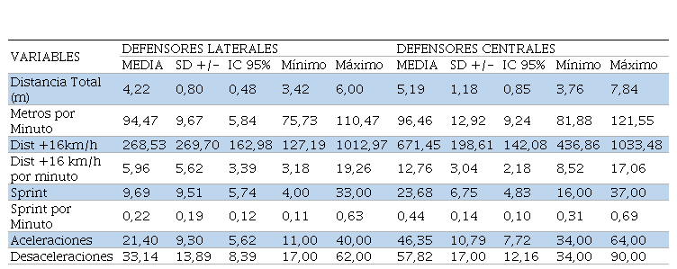 El perfil particular de cada posición y, en especial, de cada partido puede ser muy variable. Por lo tanto, algunas de las variables analizadas pueden llegar a referenciar la posición del jugador dentro del campo de juego. Para un análisis más preciso de las variables desarrolladas se dividió a los jugadores según su posición: defensores (Tabla 2), volantes (Tabla 3) y delanteros (Tabla 4).