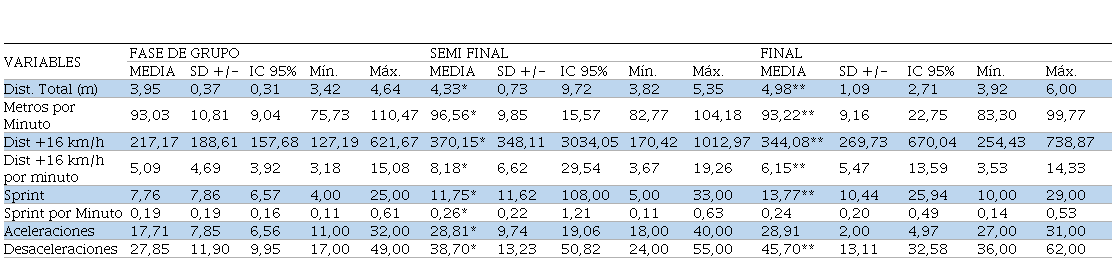 También se observó que, cuando más pasaban los partidos, es decir, el desgaste físico era mayor, los datos obtenidos fueron en decadencia, principalmente las métricas de intensidad, como metros por minuto, distancias recorridas en alta intensidad; en cambio, en el volumen total, los metros totales recorridos, fueron en aumento, esto podría ser debido a que los jugadores titulares pasaban más tiempo en cancha, fundamentalmente los partidos decisivos, como semi final y final.