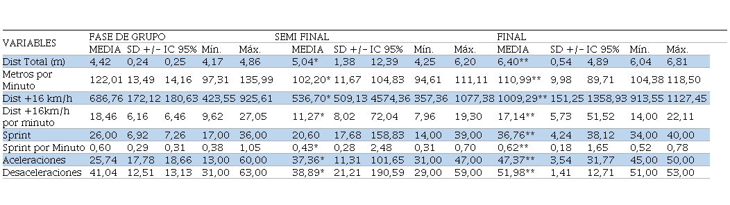 Al observar, las métricas durante las fases del torneo, las variantes de mayor modificación fueron las locomotivas, especialmente la distancia total donde en el partido final ocurrieron los valores más altos, mientras que, en las demás métricas, las neuromusculares fueron decayendo (esto se debió a que, en cuatro días, se jugaban cinco partidos). En consecuencia, la formación debe ser apropiada con respecto a las demandas de la competencia, para que los jugadores estén adecuadamente preparados y, más concretamente, durante los periodos de máxima actividad del partido (Doncaster et al., 2020).