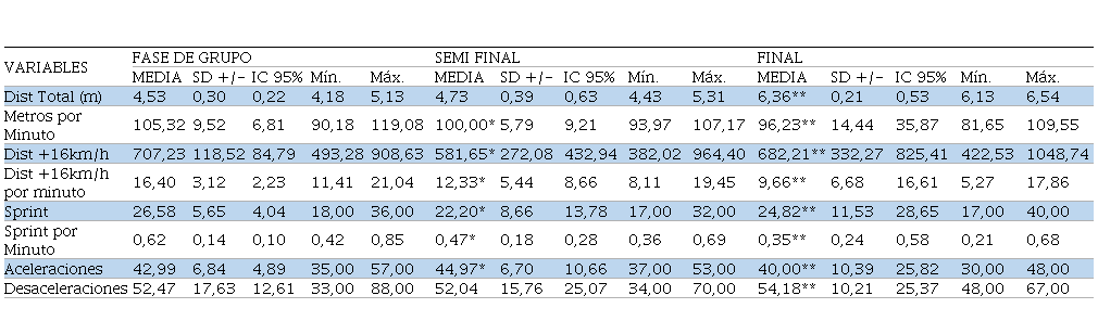 En la Tabla 1, se visualizan las variables analizadas, como también se puede observar el análisis estadístico sobre todas las variables analizadas, con sus respectivos desvíos estándar, intervalos de confianza (95 %), mínima y máxima, durante los cinco encuentros disputados en el Torneo Nacional de Selecciones 2019 (n=50).