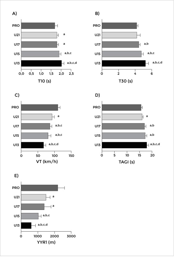 A) Tiempo en sprint lineal 10 metros, B) Tiempo en sprint lineal 30 metros, C) Tiro del balón, D) Test de Agilidad Illinois, E) Yo-Yo test de recuperación intermitente nivel I. .: diferencias vs PRO; .: diferencias vs U21; .: diferencias vs U17; .: diferencias vs U15.