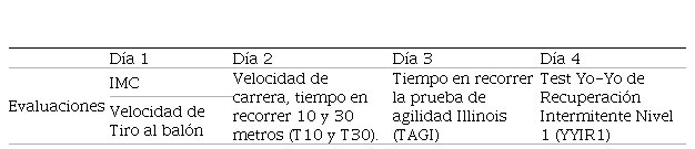 Los participantes llevaron a cabo las evaluaciones para la obtención del índice de masa corporal (IMC) y las pruebas de condición física durante el horario AM, a una temperatura de 15º, con una humedad relativa del aire de 75% aproximadamente. Se solicitó a los participantes que evitaran realizar ejercicio extenuante 24 horas antes de las pruebas, para impedir efectos de fatiga en cada evaluación. Se realizó un calentamiento dirigido por el preparador físico de cada categoría, que consistió en una parte general, que incluyó carrera suave, movimientos multidireccionales, estiramientos dinámicos, para posteriormente realizar acciones específicas para cada prueba, con una duración total de 20 minutos (Tabla 1).