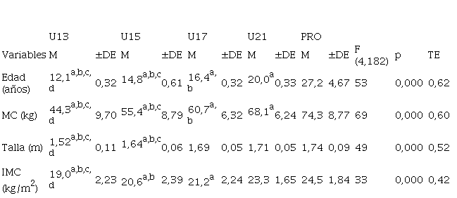La Tabla 2, registra datos estadísticos descriptivos según su edad, variables básicas antropométricas e IMC; evidencia que el grupo PRO, posee mayores valores en comparación a las demás categorías (p < 0,001), en torno a las variables de edad (F = 53 y TE = 0,62), MC (F = 69 y TE = 0,60), Talla (F = 49 y TE = 0,52) e IMC (F = 33 y TE = 0,42).