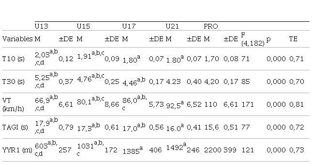 Abstract: Currently, soccer is a sport that demands high physical performance, so knowing the characteristics of the physical condition of players in the different categories of development is essential for conducting an optimal training process. Thus, the objective of this study is to evaluate the physical condition of soccer players from a professional club in Nicaragua, according to the age category in which they played. This is a descriptive and comparative study of the physical condition of 187 soccer players between the ages of 13 and 31, distributed by category, according to year of birth and the professional team they were on. The PRO group presented higher performance in comparison to the U13, U15, U17, and U21 categories (p<0.001) in the 10 meters linear sprint time (F=71 and TE=0.71), 30 meters linear sprint time (F=85 and TE=0.70), shooting speed (F=171 and TE=0.81), time in Illinois agility test (F=77 and TE=0.72), and in meters ran in the Yo-Yo intermittent recovery level 1 (F=121 and TE=0.73). The study shows that there is a higher performance of the older categories in the physical aspects. These results can serve as reference or comparison parameters of the physical performance of young and adult players at a national level in Nicaragua.