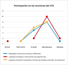 Los docentes contestan acerca su participación en las reuniones de los CTE (autoevaluación), en el trabajo individual, en equipo y reuniones plenarias, mayoritariamente casi siempre y a veces hicieron lecturas, lograron el diálogo e intercambio de experiencias, así como compartir y acordar los tiempos para el trabajo y lograr los productos en las sesiones. Gómez (2019) reconoce que los CTE son una organización compleja en la que el director y docentes trenzan los hilos del tejido escolar durante sus reuniones, en las que se presentan liderazgos múltiples, y aunque en los profesores es menos visible que en los directivos, no es menos importante.